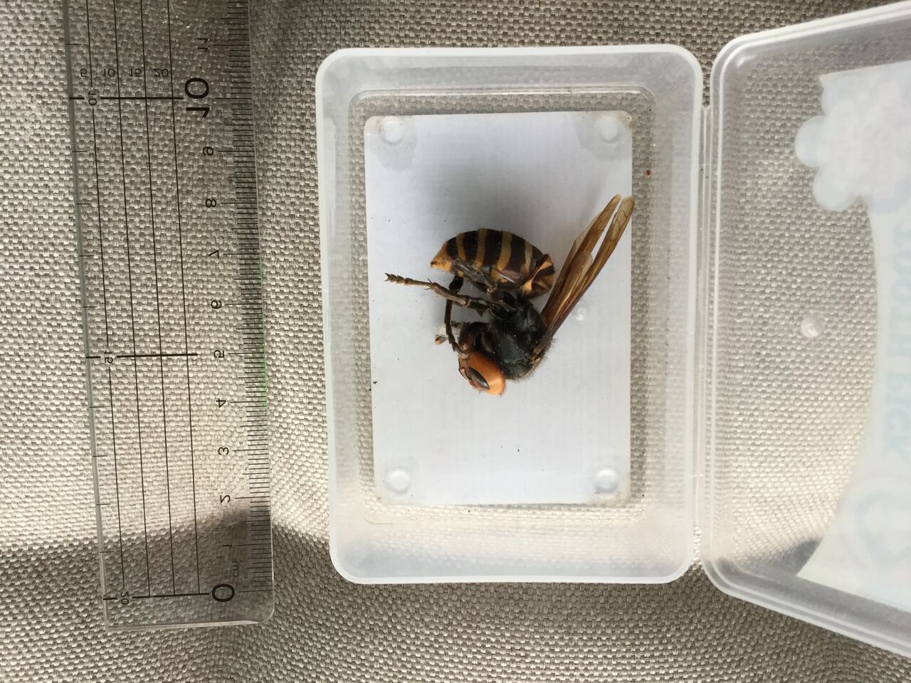 以下の写真のように、この殺人ホーネットは、5月初め頃に、日本の淡路島、洲本市の山の界隈にウオーキングしていた時に、道に落ちていたのを拾いました。