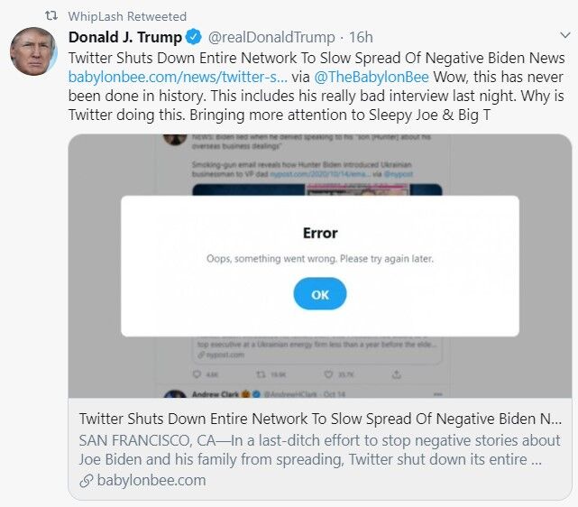 Twitterはbabylonebee.com/twitter-s…@ThebabylonBee経由のネガティブなバイデンニュースのゆっくりとした広がりのためネットワーク全体をシャットダウンする