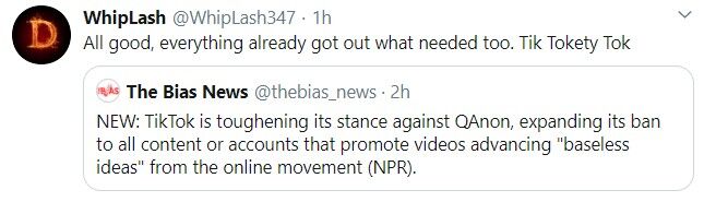 NEW:TikTokは、QAnonに対するスタンスを強化し、オンラインムーブメント(NPR)から「根拠のないアイデア」を推進するビデオを促進するすべてのコンテンツまたはアカウントに禁止を拡大しています。