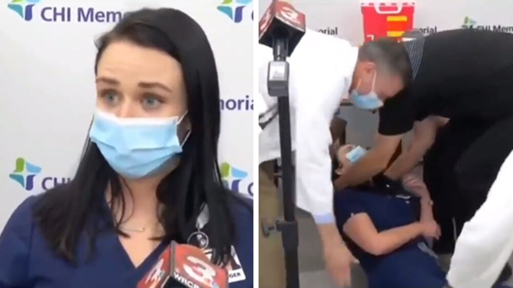 コロナウイルスワクチンを接種して数分後、ワクチン洗脳された看護師は意識を失い、ライブTVで倒れる
