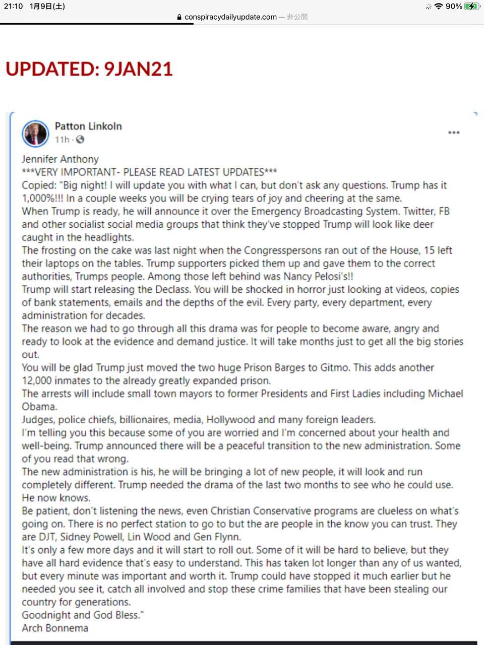 コピー:ビッグナイト! 私ができることであなたを更新しますが、質問はしないでください。 トランプはそれを1,000%持っています!!! 数週間で、あなたは喜びの涙を流し、同時に歓声を上げるでしょう。 トランプの準備ができたら、彼は緊急放送システムでそれを発表します。 トランプを止めたと思っているツイッター、フェイスブック、その他の社会主義メディアのグループは、ヘッドライトに捕らえられた鹿のように見えるだろう。